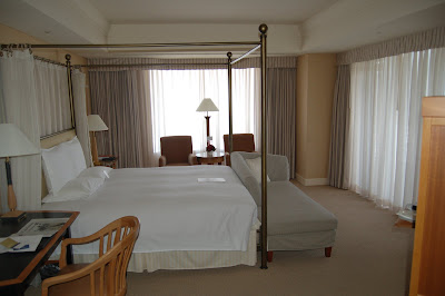 9 times out of 10 Royal Ambassadors are upgraded to Suites, and this was one of the few times that I wasn’t, it did turn out to be a very nice room. It was much larger than the other rooms on the floor as it was at the end of the hotel which is curved. It had a four-poster bed and a very nice marble bathroom with separate shower, two sinks, heated toilet seat, and the smallest TV I’ve seen in a long time! Large panoramic windows provided a fabulous view across the bay, and although there appeared to be a balcony, you couldn’t get out onto it. The style of the bedroom was a little dated in comparison to some of the newer stylish hotels in the city, but it wasn’t without its charm.