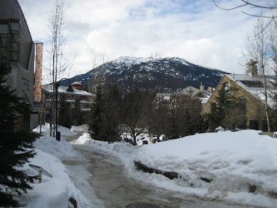 The drive up to Whistler was about 80 miles through very scenic roads with many road works along the way. It was a very clear day with no hint of snow so we kept going. The town itself was very scenic with lots of skiers still enjoying the slopes. We soon found a café and spent a few hours people watching.